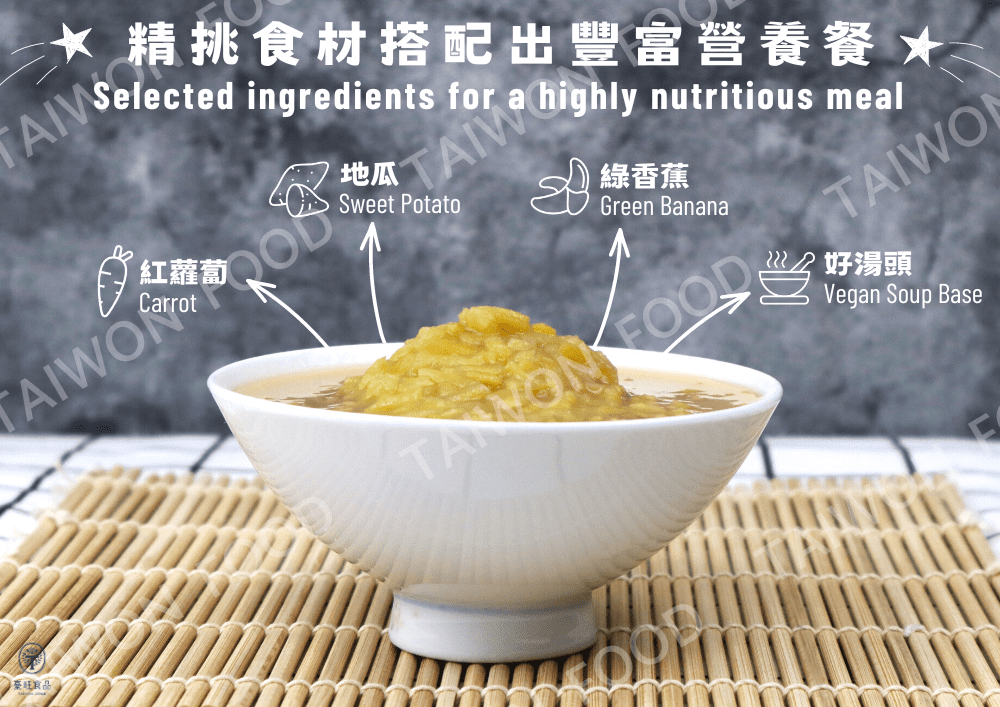 ◆介護輔食Universal Design Foods◆銀髮友善Eatender(Elderly Friendly)◆豐富營養Highly Nutritious◆無蔗糖Sucrose Free ◆精挑食材搭配出豐富營養餐Selected ingredients for a highly nutritious meal◆紅蘿蔔Carrot◆地瓜Sweet Potato◆綠香蕉Green Banana◆好湯頭Vegan Soup Base ◆地瓜の營養Sweet Potato’s Nutrition◆維生素A Vitamin A -幫助牙齒和骨骼的生長發育Helps teeth and bones growth and development◆