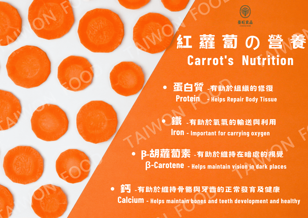 維生素C Vitamin C -具抗氧化作用 Antioxident Effect◆膳食纖維 Dietary Fiber -可促進腸道蠕動Promote intestinal peristasis ◆紅蘿蔔の營養Carrot’s Nutrition◆蛋白質Protein -有助於組織的修復 Helps Repair Body Tissue◆鐵 Iron -有助於氧氣的輸送與利用 Important for carring oxygen◆β-胡蘿蔔素 β-Carotene -有助於維持在暗處的視覺Helps maintain sision in dark places◆鈣 Calcium -有助於維持骨骼與牙齒的正常發育及健康Helps maintain bones and teeth development and healthy ◆好湯頭◆採用天然食材Select Natural Ingredients◆鮮美又安全Tasty and Safe◆無任何添加Additive Free ◆地瓜·綠香蕉帶給您幸福又健康的一天Start a happy healthy day with Sweet Potato & Banana UDF