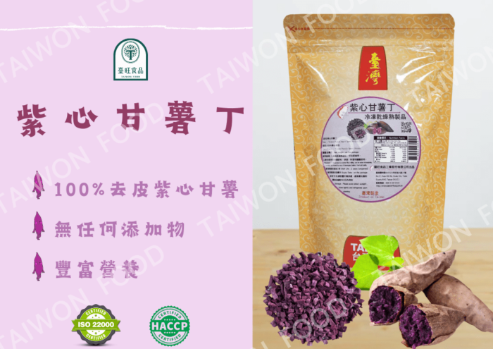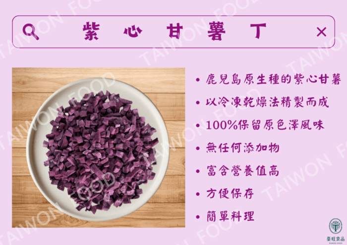 紫心甘薯削皮切丁後,先蒸熟再以冷凍乾燥法製作而成,原色澤風味100%完全保留,適合製作牛軋糖、雪花酥、吐司、麵包、手工餅乾及粥品料理,用來裝飾濃湯、沙拉及其他菜餚亦相當出色。