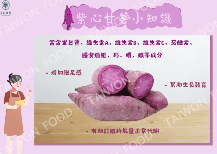 琉球群島原生種的紫心甘藷,飄洋過海來到福爾摩莎島臺灣之後,發揮了瘦鵝精神,奮力的吸收了大地的精華,汲取了南方暖陽的能量,使得纖維素,維生素和甜美度,都大幅的提昇了,尤其所含的菊芋糖,更是身體順暢無阻礙的關鍵來源,特殊的紫色,是許多芋頭酥必需搭配的關鍵配方,烘焙業內餡的變化,則缺它不可,日常生活中,搭配精力餐沖調麥片餐包,更是聰明的選擇。