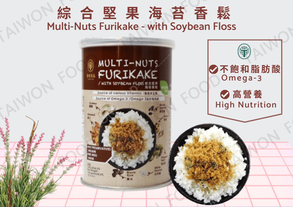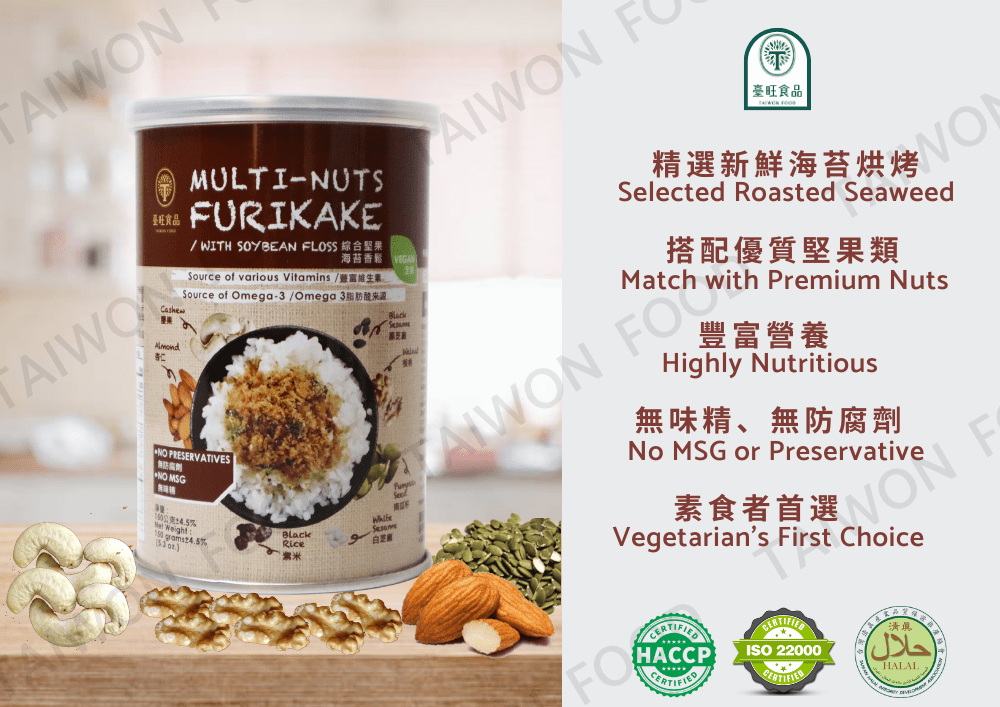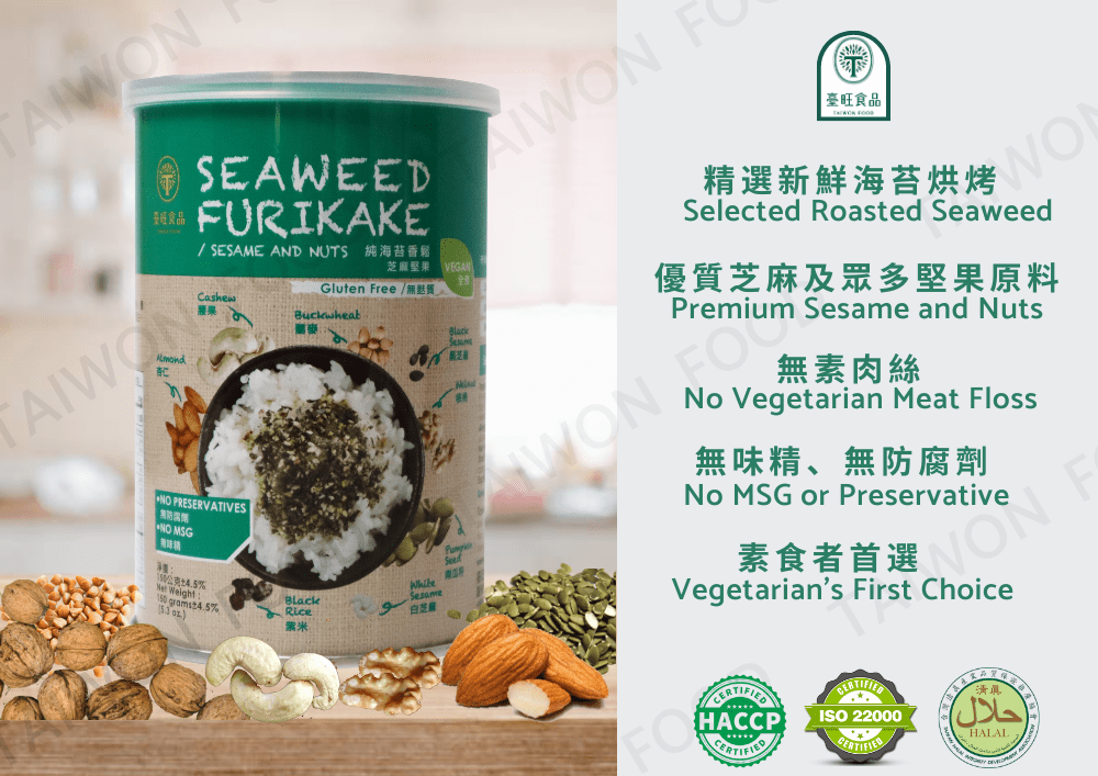 ◆精選新鮮海苔烘烤Selected Roasted Seaweed◆優質芝麻及眾多堅果原料Premium Sesame and Nuts◆無素肉絲No Vegetarian Meat Floss
