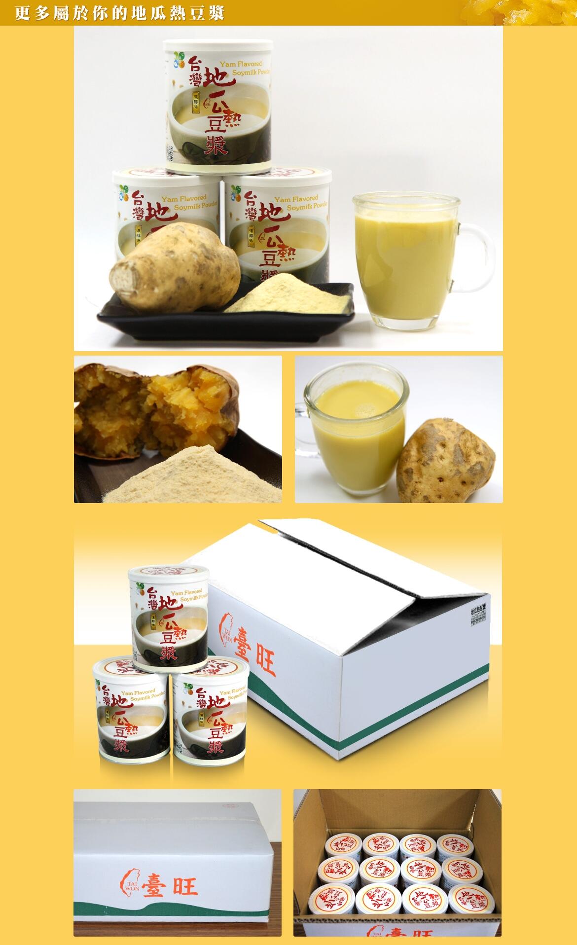 臺旺 – 臺灣地瓜熱豆漿 禮盒裝 (400克 / 罐x 3罐一組 )內容物名稱:57號地瓜熟製粉、非基改豆漿粉(黃豆、麥芽糖漿)過敏原提示:本產品含大豆製品,可能導致過敏症狀。淨重:400公克 x 3罐一組產地:台灣製造保存期限:密封18個月